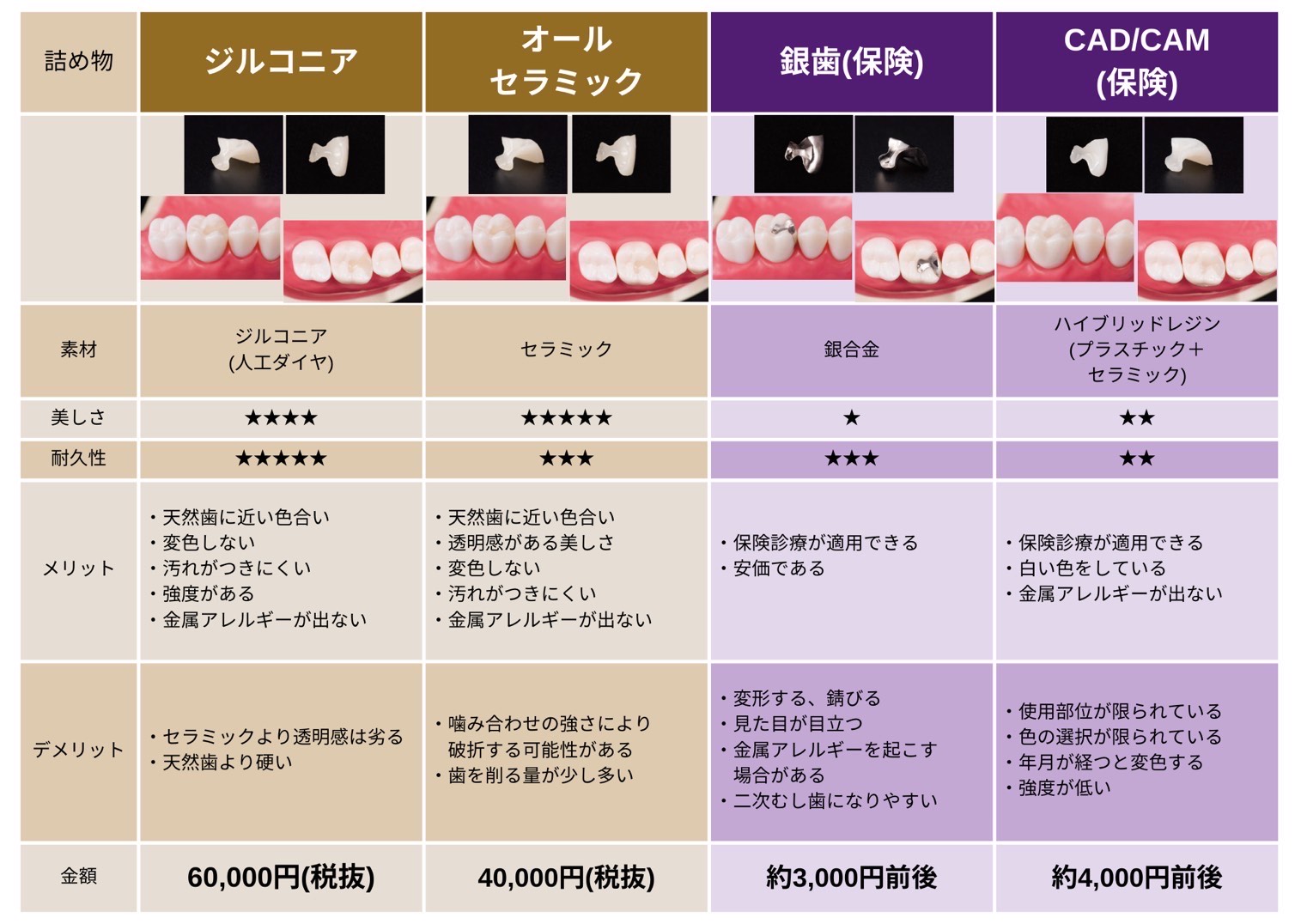 審美歯科 「銀歯が目立って人前で笑えない…。」 白い詰め物・かぶせ物で、そんなお悩みを解消します。 白い詰め物・かぶせ物とは 白い詰め物・かぶせ物とは、セラミック(陶材)を使用した技工物のことで、銀歯のように目立つことがなく見た目の美しさを保つことができます。 「笑うと、奥歯につめた金属が見えて人前で話すのが恥ずかしい」、「人前で口を開けて笑えない」といったお悩みが解消します。 白い詰め物・かぶせ物には下記のような種類があります。 治療の種類 オールセラミック 見た目が美しくほとんど変色しません。汚れ(プラーク)が付きにくいのも大きな特長です。金属を使用しないためアレルギーの心配がありません。 ハイブリッドセラミック セラミックとレジン(プラスチック)を混ぜあわせたものです。オールセラミックよりも色調は多少劣り、長期的にみると変色します。金属アレルギーの心配はありません。 メタルボンドセラミック 中心部に金属を使用し、その表面にセラミックを焼き付けたものです。 ラミネートベニア 歯の表面を0.5mm程度削り、その上に薄いセラミックを張り付ける治療です。 義歯 料金 バネが目立ちにくいノンクラスプデンチャー 50,000円~200,000円(税抜) 審美歯科に関するお問い合わせ 審美歯科に関するご相談は、どうぞお気軽にお問い合わせください。 03-5327-4618 休診日:木曜・日曜・祝祭日